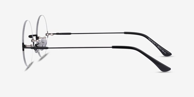 These black eyeglasses definitely have a classic vintage feel. This rimless metal frame features a black finish and perfectly round lenses. The slender metal arms are completed with plastic arm tips, making this look demure and simple. Spring hinges add flexibility and comfort.